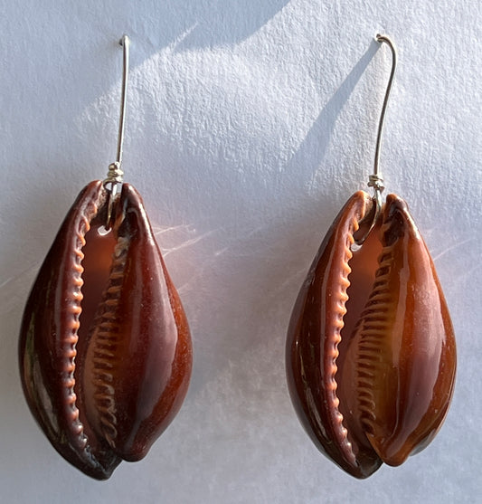 Translucent Honey and Brown Serpent's Head Cowrie Earrings